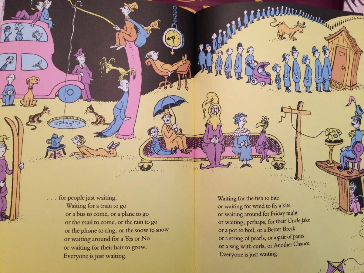 In Oh, the Places You’ll Go!, published in 1990, Dr Seuss devotes several pages to what he calls the Waiting Place. Everyone there is just waiting: for a train, for the rain, for a yes or a no, for their hair to grow. The list accumulates into something genuinely melancholy. Then Seuss tells the reader to escape it.